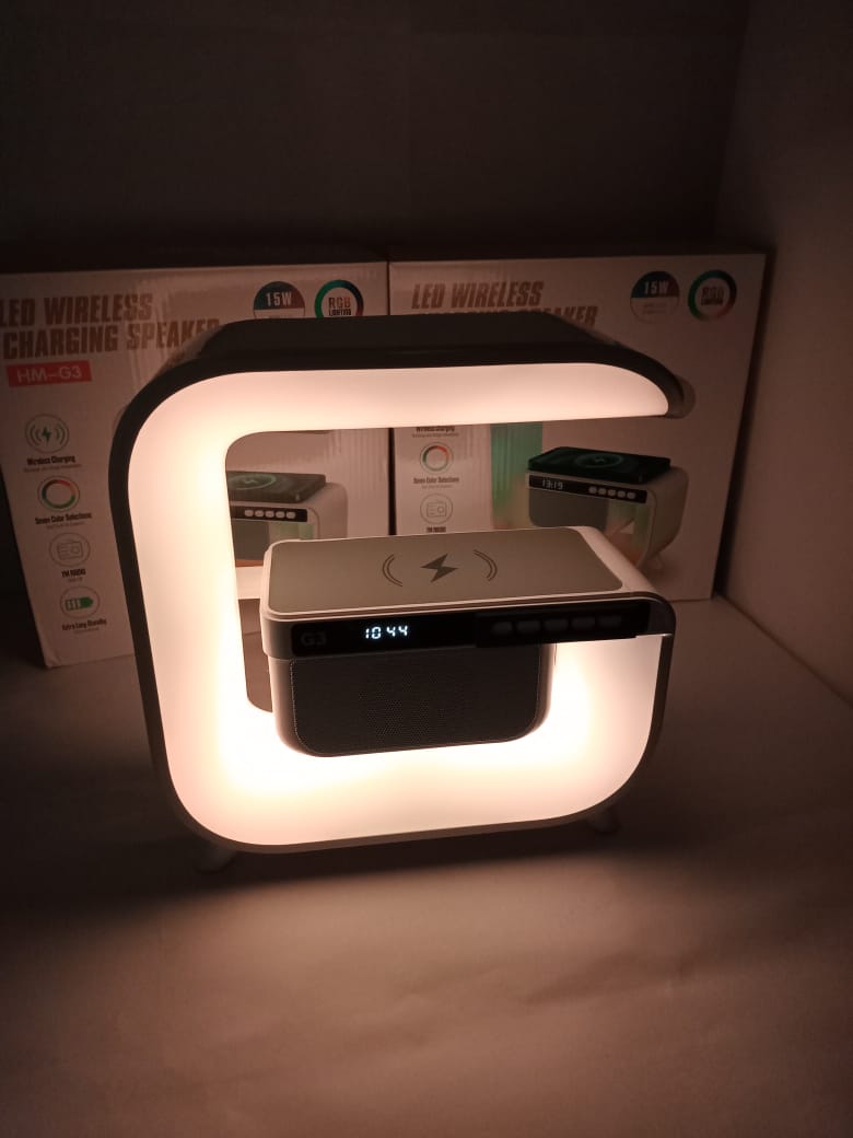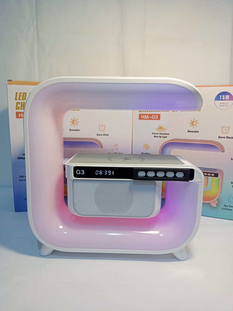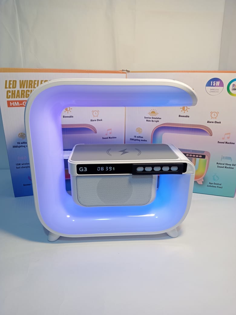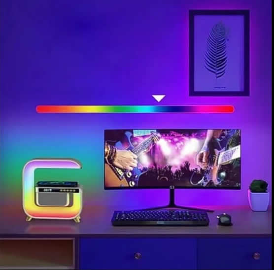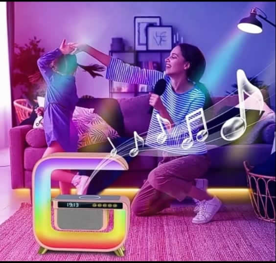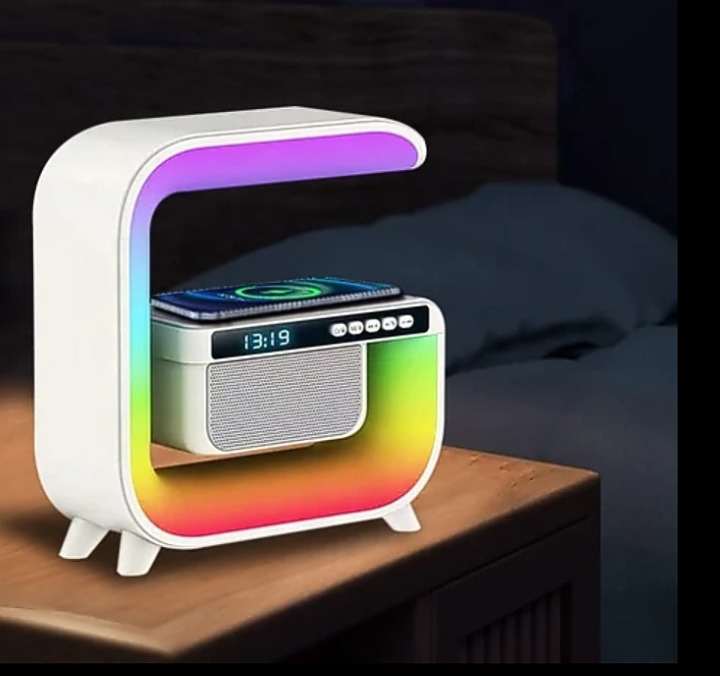 Reloj despertador colorido, cargador inalámbrico, altavoz de música Bluetooth, batería incorporada, control de aplicación, y adaptador de carga USB. Es una elegante lámpara de escritorio multifuncional.