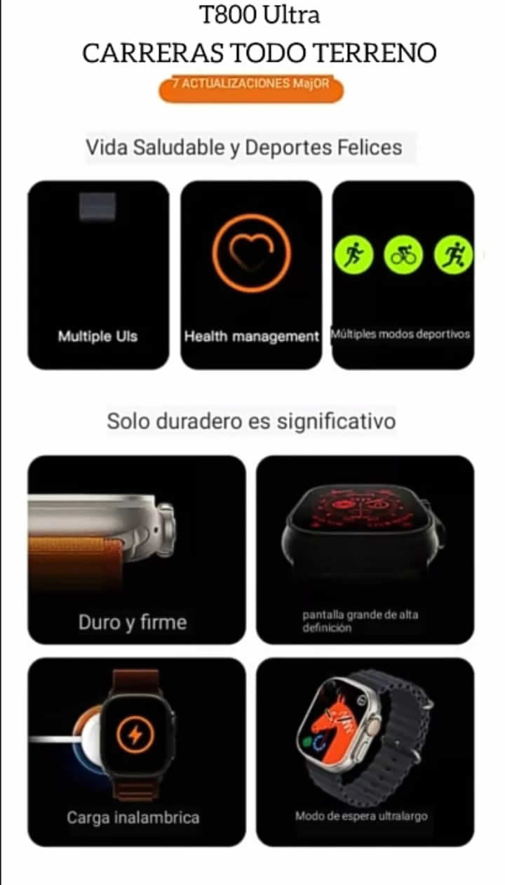 Además de su funcionalidad, el T900 Ultra Big ofrece un conjunto de características de seguimiento de actividad física y bienestar. Registra tus pasos, calorías, distancia recorrida, monitoriza tu sueño y controla tu ritmo cardíaco, presión arterial y niveles de oxígeno en sangre. También cuenta con un recordatorio sedentario para ayudarte a mantenerte activo.